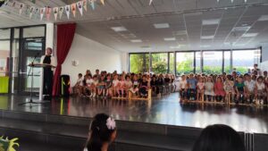 30.08.2025 Heute ist es so weit – ganz offiziell erhält die Schule Am Kastanienhain das Siegel Naturparkschule. Im Rahmen der Summerlounge stellt sich die Schule mit einigen ihrer gelaufenen Projekte vor. Geladene Gäste sind Herr Dr. Ausbüttel (Stellvertretung des Landrats), Umweltpädagogin Frau Orth (leitet u.a. die Begehung der umliegenden Obstwiesen) und Frau Knebel (Försterin). Nach einleitenden Worten von Frau Bickmann erklären einige Drittklässler ihre Gedanken zur Natur-Park-Schule, Frau Sander-Hubrich zählt sämtliche Projekte, die schon mehrere Jahre an der Schule laufen, auf und Alina Gulevich gibt einen Einblick in den diesjährigen Ausflug zu den Bienen. Zu guter Letzt erfolgt der „offizielle“ Teil und das Zertifikat der Naturparkschule wird übergeben. Eine rundum gelungene Feier, welche in einer entspannten Summerlounge-Atmosphäre aus klingt.